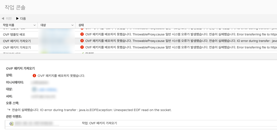 OVF 패키지를 배포하지 못했습니다. ThrowableProxy.cause 일반 시스템 오류가 발생했습니다. 전송이 실패했습니다. IO error during transfer : Java.io.EOFException: Unexpected EOF read on the socket.