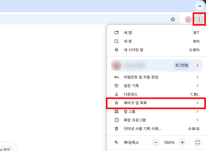1. 우측 상단 점 세개 선택 후, 메뉴에서 북마크 및 목록 선택